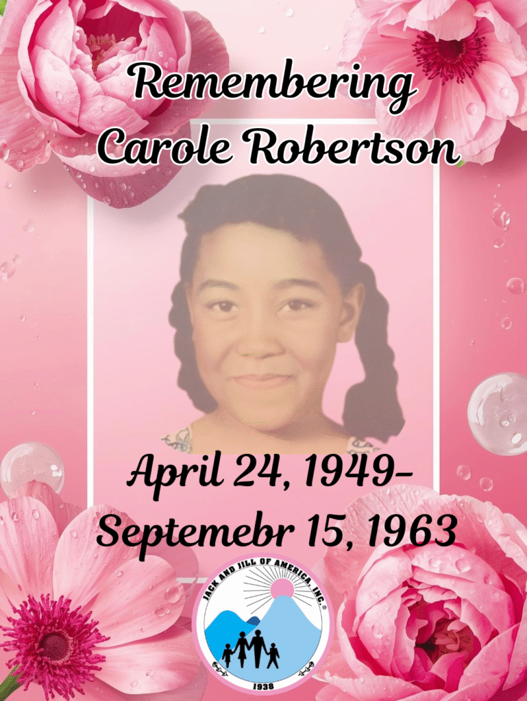 As we gather for our annual Jack and Jill Day activities, we take time to remember a vibrant young leader, Carole Robertson, who was a member of the Jack and Jill of America teen group in Birmingham, Alabama. She was tragically killed on this day in 1963 while preparing to march for civil rights. We honor her memory and the dreams she held for a better future by recommitting to our mission of developing future African American leaders and fostering a community dedicated to service and social justice.